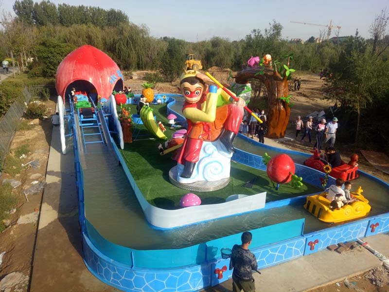 花果山漂流是一款兒童漂流類游樂場設備,玩法類似于軌道小火車,但是運行軌道為水道。 玩法: 水道中的水在兩個發動機的推動下緩緩流動,而漂流船則漂浮其上并隨著水流前進。在漂流船兩側裝有導輪裝置,可引導船只轉向并避免船只磕碰水道;坡道處則采用單獨的電機帶動導軌,利用掛鉤式裝置帶動船只爬坡,當船只至*高點處依靠重力和導軌的雙重驅動沖下坡道,好玩安全又刺激!