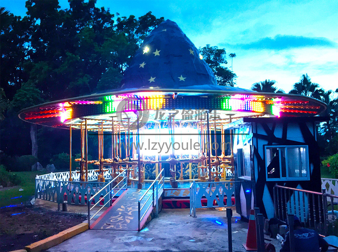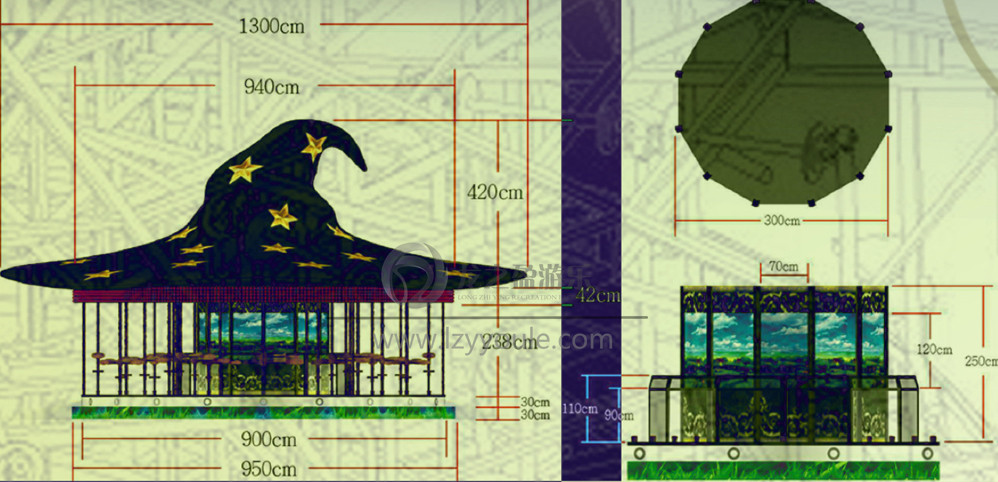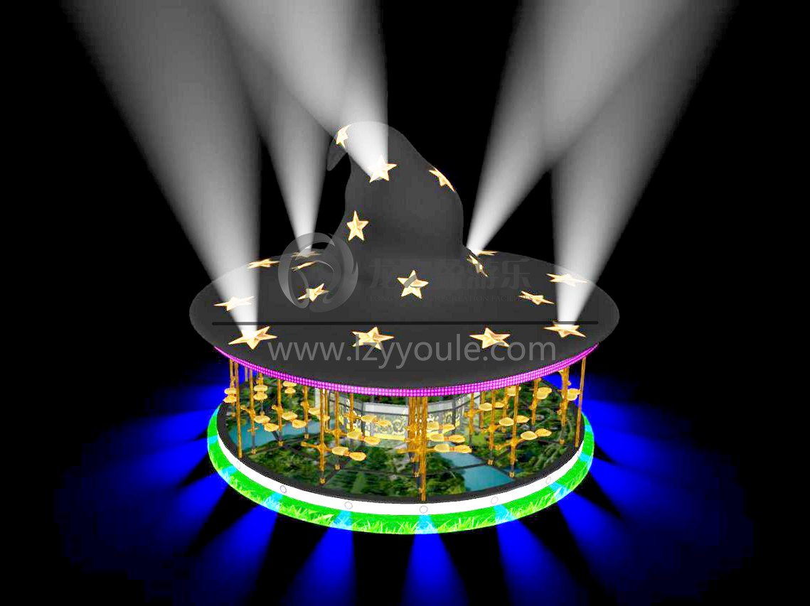 帽子上面設(shè)計了七束不同顏色的巨型燈光。頓時成為游樂場的地標式游樂設(shè)備!