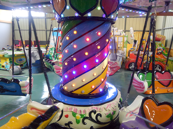 兒童游樂(lè)設(shè)備七彩小飛椅顯得小巧、卡通,在設(shè)備的*低端有一個(gè)固定的托盤,托盤上面是用來(lái)支撐飛椅的支架,在支架上面安裝設(shè)計(jì)了卡通圖案和彩色的燈光,支架最頂端也是帶有卡通圖案和彩色燈光的可以旋轉(zhuǎn)的轉(zhuǎn)盤,轉(zhuǎn)盤上面鏈接著鎖鏈而鎖鏈鏈接著飛椅。