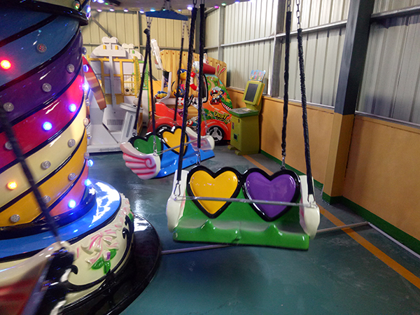 七彩小飛椅是一個(gè)很新穎的兒童游樂(lè)設(shè)備,其華美可愛的外表和對(duì)小朋友來(lái)說(shuō)很具有挑戰(zhàn)性的游戲環(huán)節(jié)是非常的受歡迎的。我們龍之盈生產(chǎn)的這款七彩小飛椅就是為了能讓小朋友更好的玩耍,七彩小飛椅旋轉(zhuǎn)的速度是可變換調(diào)節(jié)的,而且配備七種顏色的彩色燈光,在夜幕下更是顯得魅力非凡,小朋友們坐在吊椅上可以體驗(yàn)到在空中飛舞的感受從而收獲無(wú)比的歡樂(lè)!