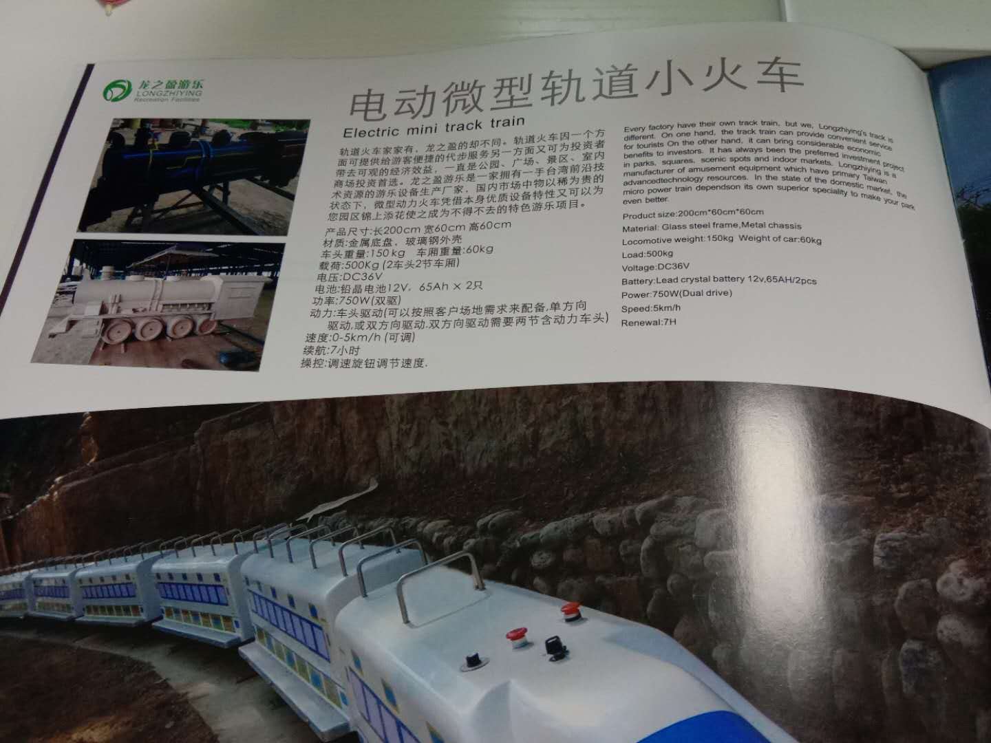 下圖是我們龍之盈游樂(lè)公司生產(chǎn)的電動(dòng)微型軌道小火車的圖冊(cè)介紹,我拍的不是很清晰,在給你們?cè)敿?xì)的介紹一下吧,軌道火車很多游樂(lè)場(chǎng)里面都有,但是龍之盈的卻不同。軌道小火車因一個(gè)方面可提供給游客便捷的代步服務(wù),另一方面又可為投資者帶去可觀的經(jīng)濟(jì)效益,一直是公園、廣場(chǎng)、景區(qū)、室外商場(chǎng)投資的*選。